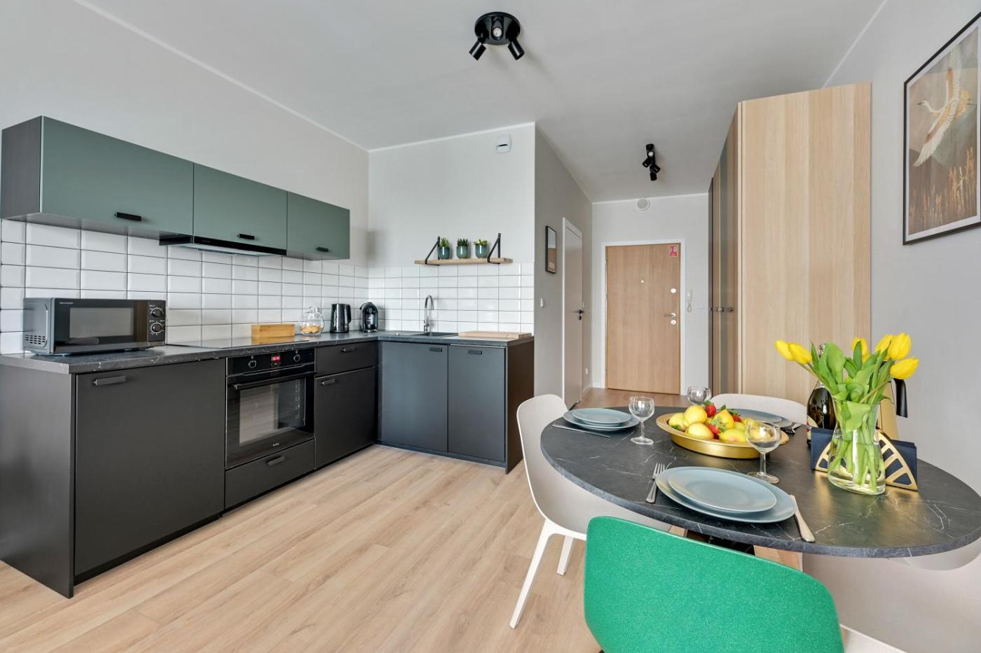 Studio typu Deluxe. Meals can be prepared in the kitchen, which features a stovetop, a refrigerator, a dishwasher and kitchenware. The studio features a washing machine, a coffee machine, a balcony with ancourtyard view as well as a private bathroom boasting a shower. The unit has 2 beds. Studio - 2 osobowy. Powierzchnia pokoju ok.: 33 mkw.