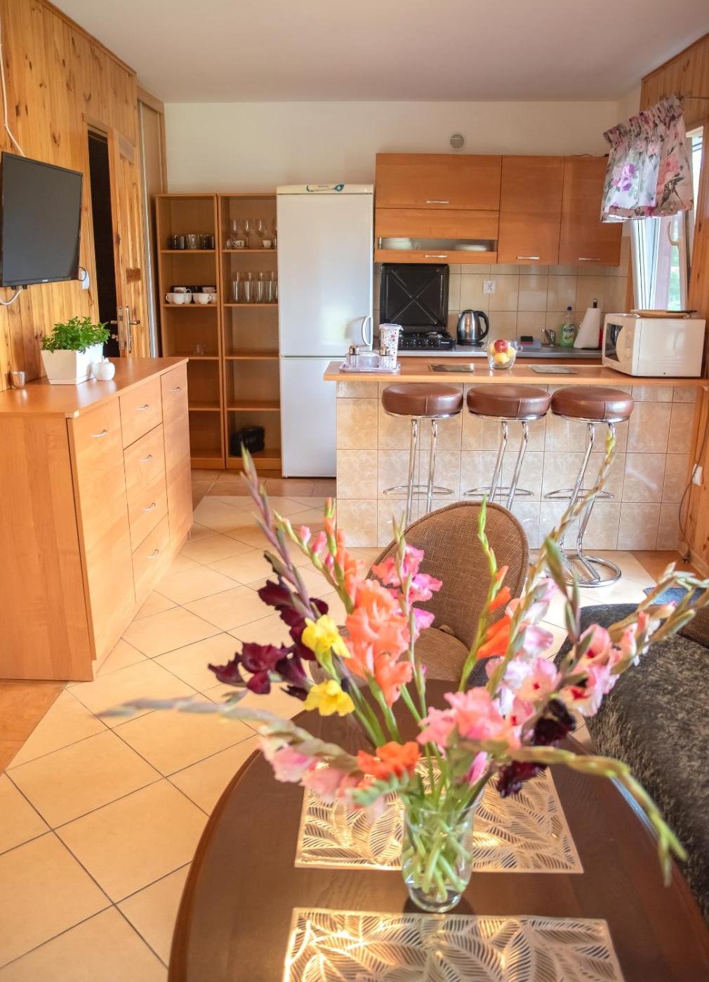 Dom z 2 sypialniami. This holiday homes standout feature is the fireplace. Guests will find a stovetop, a refrigerator, a microwave and an electric kettle in the fully equipped kitchen. The holiday home also features a barbecue. Boasting a terrace with lake views, this holiday home also offers a wardrobe and a flat-screen TV. The unit has 5 beds. Dom wakacyjny - 6 osobowy. Powierzchnia pokoju ok.: 45 mkw.