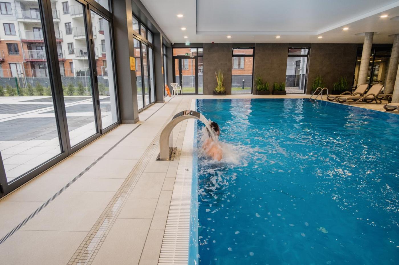 Zaplecze odnowy biologicznej obiektu SPA Polanki PARK Nemo Apartamenty Kołobrzeg obejmuje kryty basen, saunę i wannę z hydromasażem.