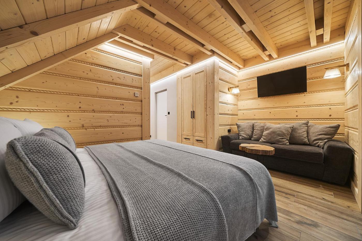 Domek. This luxurious chalet provides a hot tub, a sauna and a fireplace. This spacious chalet features 2 living rooms, 4 separate bedrooms and 6 bathrooms with a bath and free toiletries. Guests will find a stovetop, a refrigerator, a dishwasher and kitchenware in the fully equipped kitchen. The chalet also comes with a barbecue. The air-conditioned chalet features a flat-screen TV with streaming services, a washing machine, a tea and coffee maker, a seating area as well as garden views. The unit has 6 beds. Domek - 12 osobowy. Powierzchnia pokoju ok.: 270 mkw.
