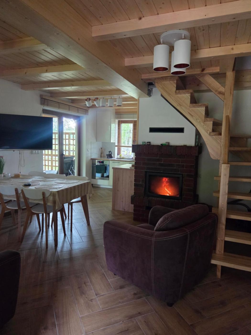 Dom z 2 sypialniami. This holiday home offers a fireplace. Meals can be prepared in the well-fitted kitchen, which comes with a stovetop, a refrigerator, a dishwasher and kitchenware. The holiday home provides a washing machine, a private entrance, a terrace with garden views as well as a shared bathroom featuring a shower. The unit offers 4 beds. Dom wakacyjny - 6 osobowy. Powierzchnia pokoju ok.: 50 mkw.